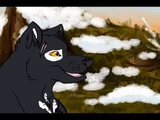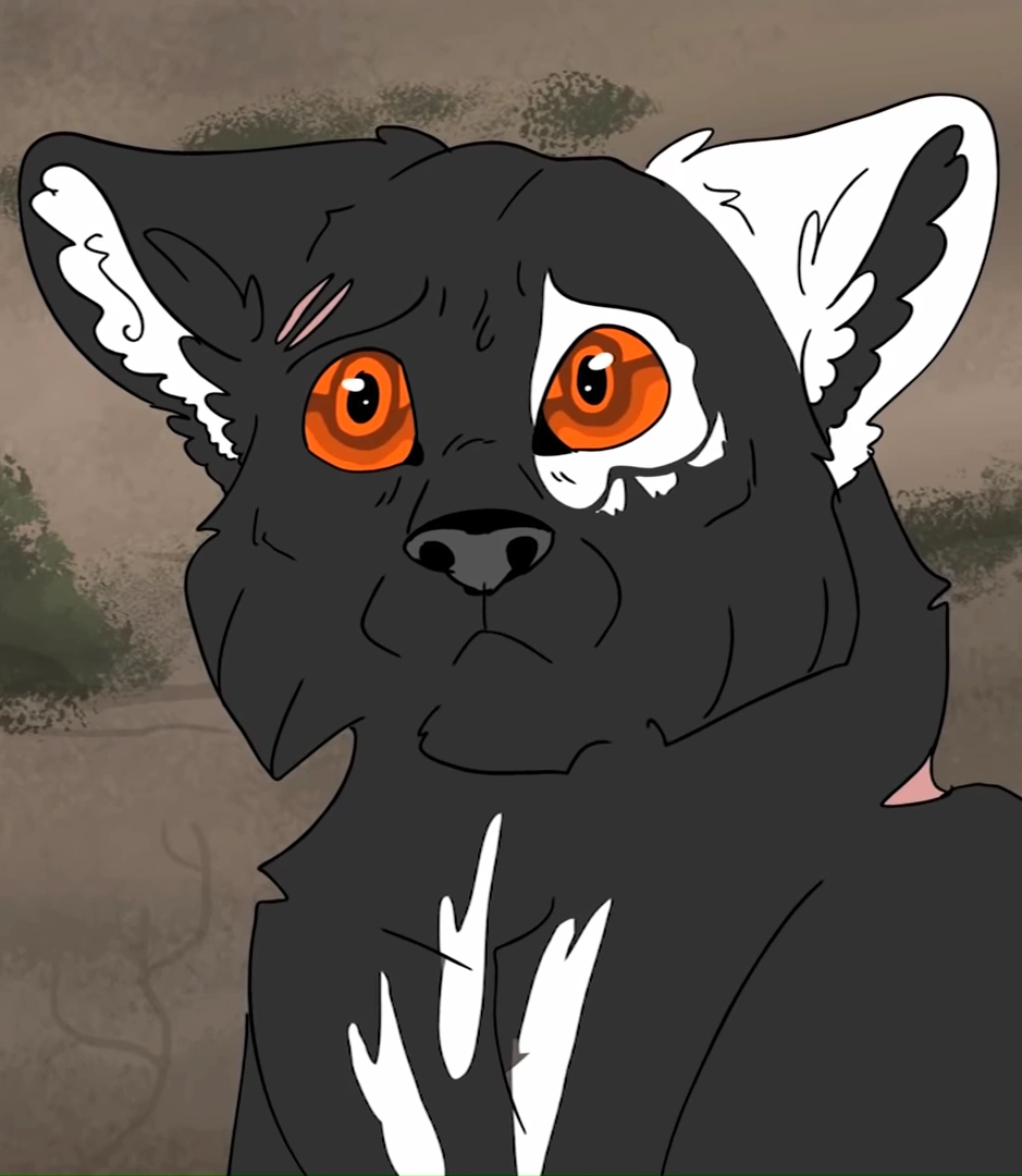 Saber is a large black wolf with three oval-ish shaped white splotches on his chest. His left ear is white with a black inner-ear and his right ear is the opposite, black with a white inner ear. He has a white patch over his left eye with three white spots underneath. He has bold Amber eyes and various scars on his pelt. One on his back, on on the back of his neck and two above his right eye.